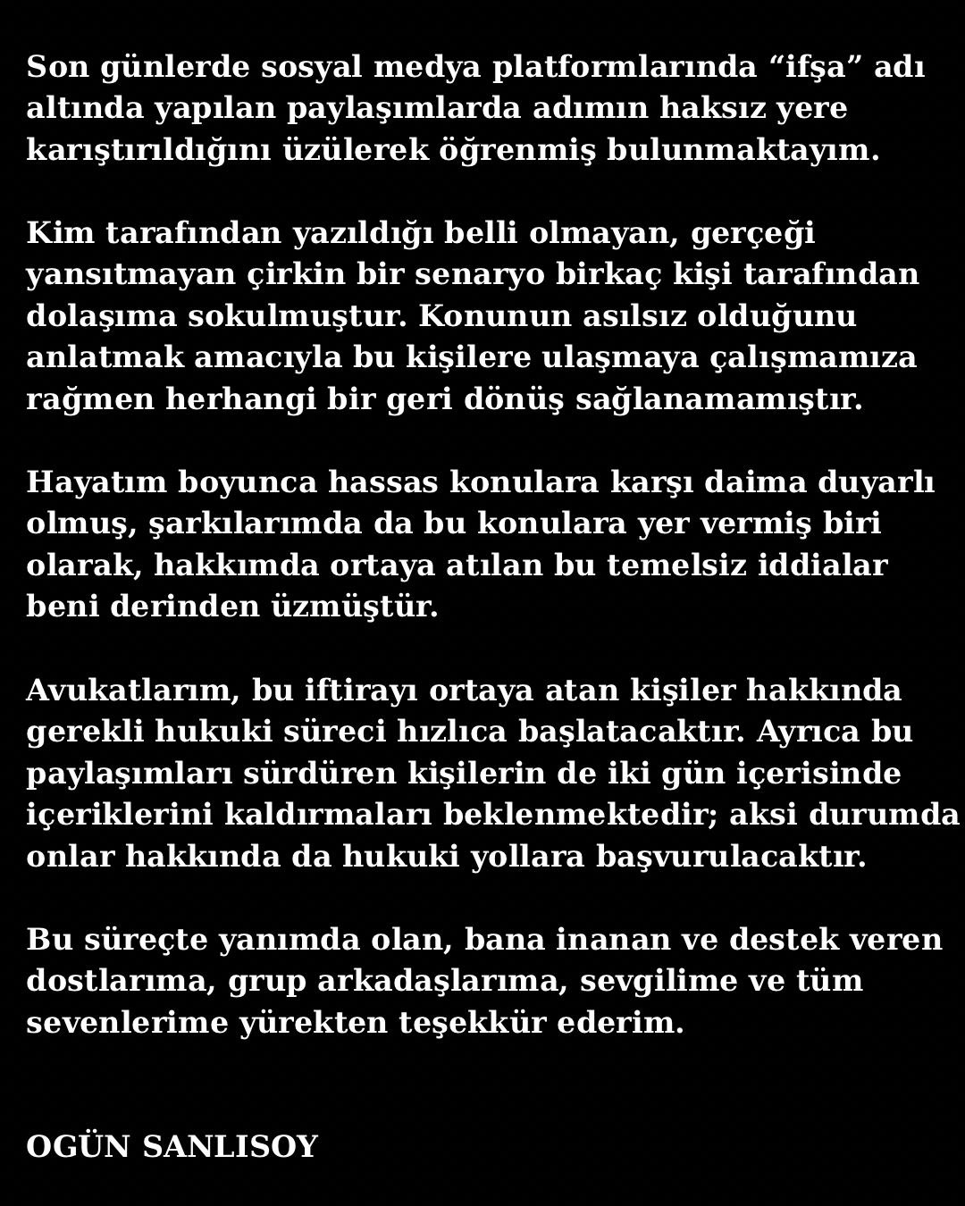 Ünlü rock müzisyeni Ogün Sanlısoy, adının son günlerde sosyal medyada yayılan "ifşa" iddialarına karıştırılması üzerine sessizliğini bozdu. Sanlısoy, avukatları aracılığıyla hukuki yollara başvuracaklarını duyurduğu bir açıklama yayınlayarak, gerçeği yansıtmayan bu çirkin senaryonun kendisini derinden üzdüğünü belirtti.
