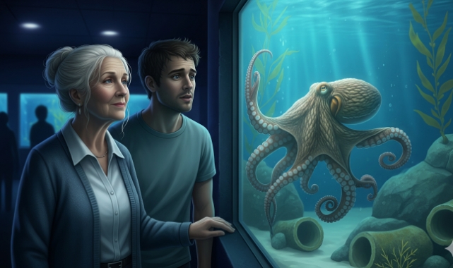 Bu iki ayrı yaşamın yani Tova ile Cameron’un ortak noktası bu akvaryum ve dev ahtapot Marcellus olacaktır. Gerçeğe giden olaylar burada başlar. Ancak dev ahtapot, eseri bilimkurgu ya da büyülü gerçekçiliğe taşımasa da hayli önemli bir yer tutmakta. Zeki bir ahtapot. İnsanları anlama ve anlamlandırmada hayli başarılı. İnsanların davranışlarını çözebilecek, Camaron’un akvaryumda çalışmaya başlamasıyla Tova ile arasındaki genetik bağı hissedebilecek yetenekte. Tova ile Cameron arasındaki genetik bağı Marcellus’un akvaryum kovuğunda biriktirdiği eşyalarla gün yüzüne çıkması, bu üçlü arasındaki bağın gel-gitlerle sağlamlaşması yazarın “müthiş hayal” gücü demek doğru olur. Marcellus, Tova ile kurduğu dostluğu, Cameron’un kendini bulmasıyla taçlandırırken kendi de ödülünü Tova’dan alıyor ebette.